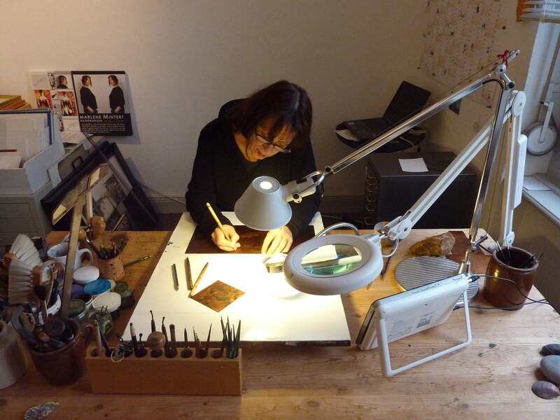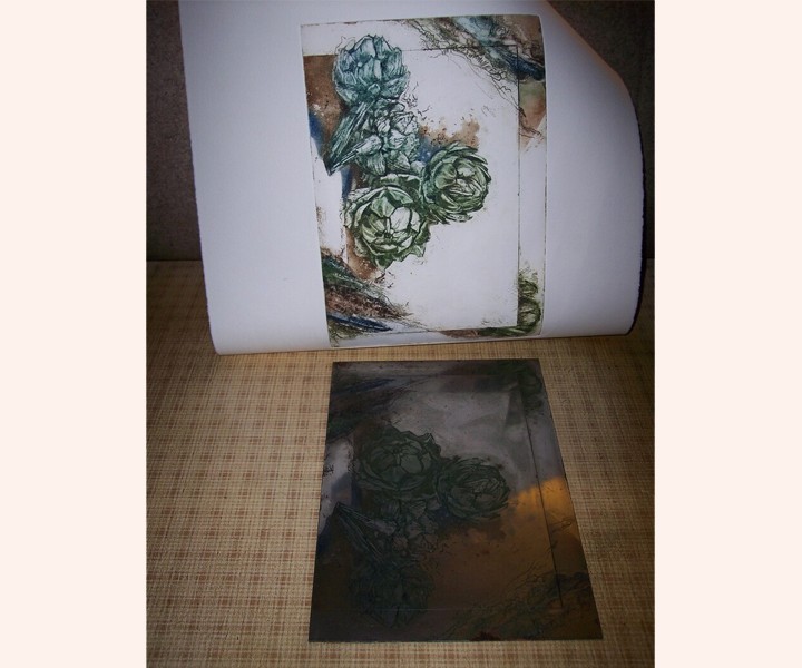 Marlene Mintert arbeitet mit unterschiedlichen Tiefdrucktechniken wie Strichätzung, Aquatinta, Vernis mou und Kaltnadel. Ihre originalen Farbradierungen entstehen in mehreren Arbeitsgängen, bei denen Farbe, Struktur und Linie in feinem Zusammenspiel wirken. Ergänzend dazu entstehen malerische Arbeiten, die dieselbe Sensibilität für Fläche und Bewegung zeigen.