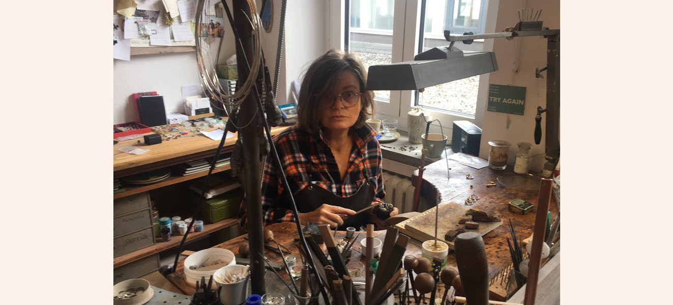 In ihrer Gold- und Silberschmiede in München verbindet Susanne Weigand seit 1996 klassische Handwerkskunst mit ungewöhnlichen Materialkombinationen: von 900er Gold oder 925er Silber über Glas-, Stoff- oder Fundstücke bis hin zu Mineralien, Perlen und Emaille.